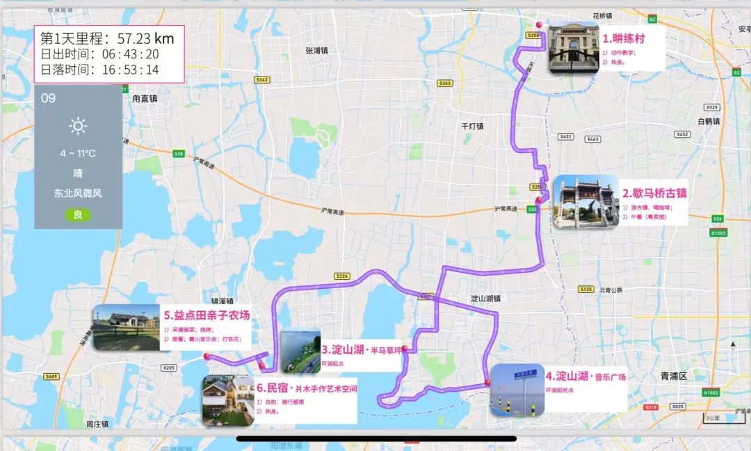 🚴畊练村→歇马桥→淀山湖·半马草坪→淀山湖·音乐广场→益点田亲子农场→民宿·爿木手作艺术空间
