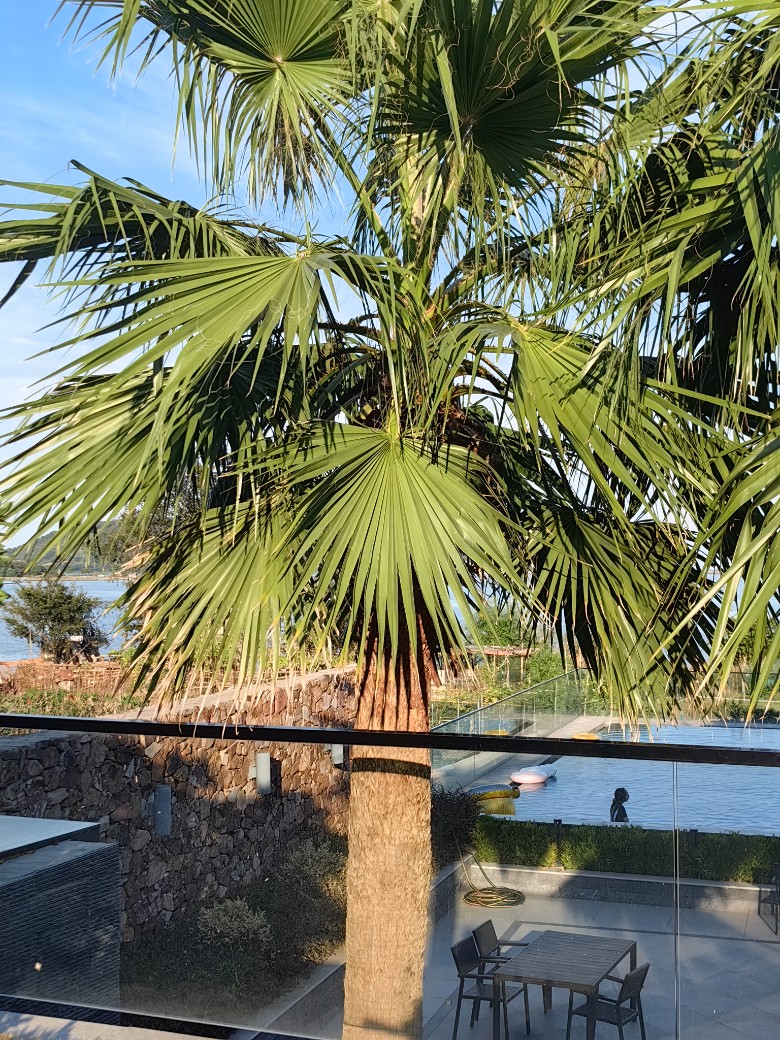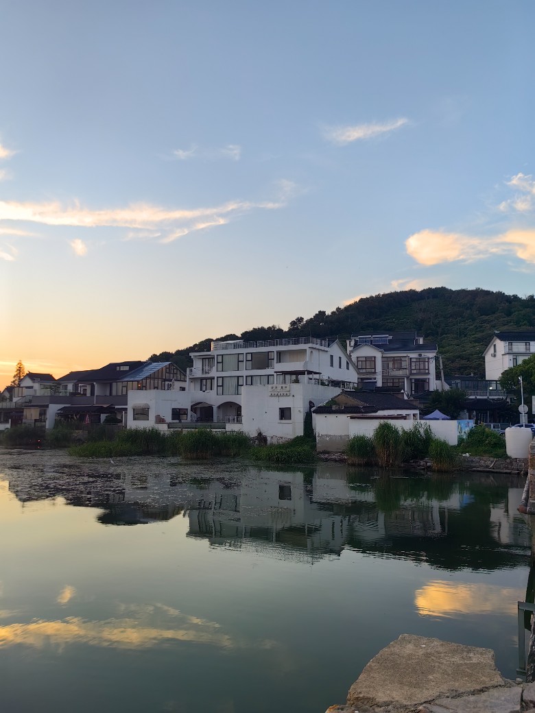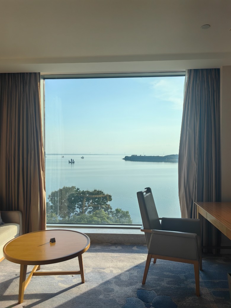 第二天早上出发去苏州,直奔酒店。酒店在太湖边,给了湖景房,大大的落地玻璃窗面朝太湖,可太美了,酒店的大堂和餐厅也全都有绝美湖景,景观应该是这家酒店最大的亮点。房间也是很大的,以至于娃爸说老家来亲戚时也要带他们来这边。八月底还是太热了,酒店周边很适合骑行,带着自行车的老哥一家也只是的周边小骑了一下。孩子们更爱泡在水里,我爸妈就坐在池边看孩子们游,还遇见了日落。用餐就选在了酒店附近的饭店,台州菜,说是苏州的新荣记,主打一个新鲜,好吃是好吃的,尤其那个沙蒜豆面,就是量不大也不便宜。