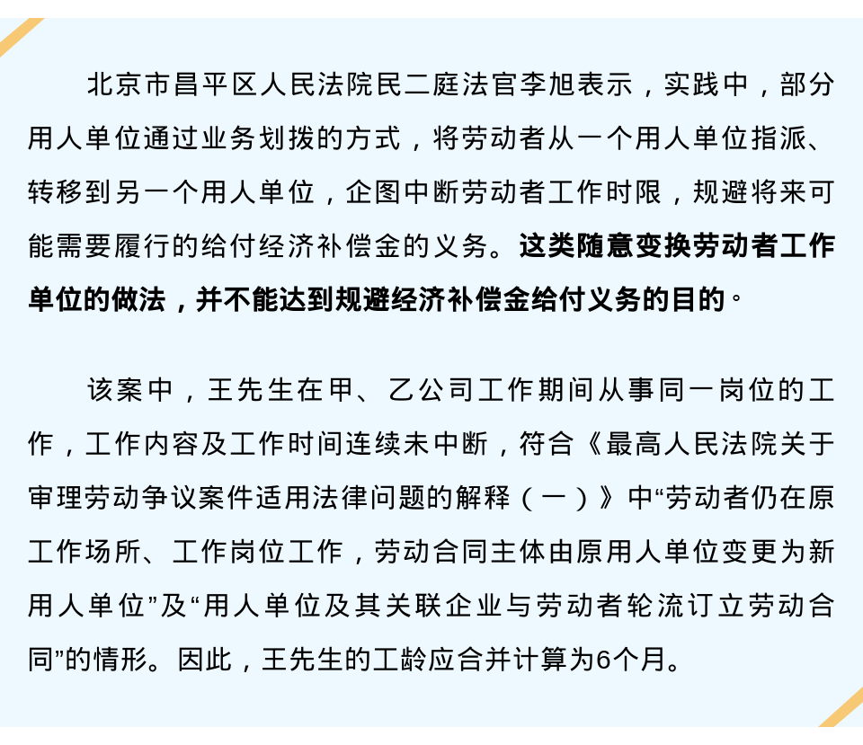 专家提醒,发生纠纷时,劳动者想要维护自己的工龄权益,一方面要保留企业更换合同或调岗的书面通知、邮件、聊天记录等,证明是“非本人原因”调动,另一方面是通过工商信息、员工证言等证据,证明关联公司之间存在股权、高管、业务混同等情况。