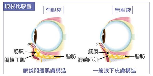人到中老年眼睑皮肤逐渐松驰,皮下组织萎缩,眼轮匝肌和眼眶隔筋膜的张力降低,出现脂肪堆积,形成眼袋。