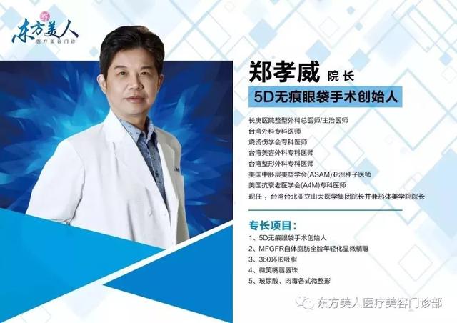 一般而言,眼袋移位手术可以解决大多数的问题,但其延伸的皮层肌肉松弛及中脸凹陷下垂等问题,却不是眼袋移位可以单独解决的。由此,郑孝威院长独创5D眼袋手术,力求为求美者打造更完美的眼部形象。