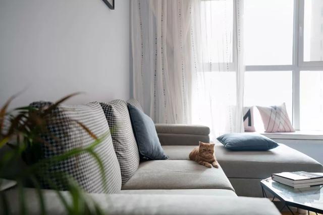 米灰色和冰蓝色的靠枕搭配很清爽。猫咪也会经常在沙发上发呆、睡觉、和屋主互动小游戏,灰色也比较耐脏。