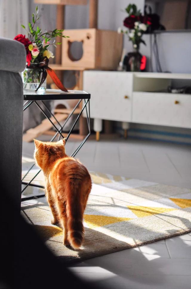 客厅一角是猫咪的小天地,容纳了她的烘干箱、猫砂盆、猫爬架。姜黄色和咖色的地毯和蓝色墙面很搭,阳光和煦,温暖舒适。