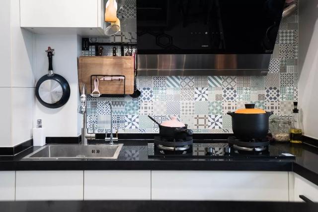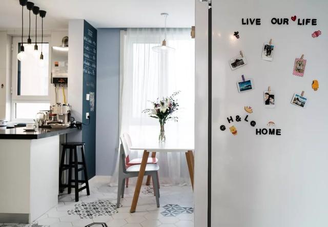 餐厅看向厨房一角,蒙娜丽莎小花砖,增添了厨房空间的活泼、文艺气息。