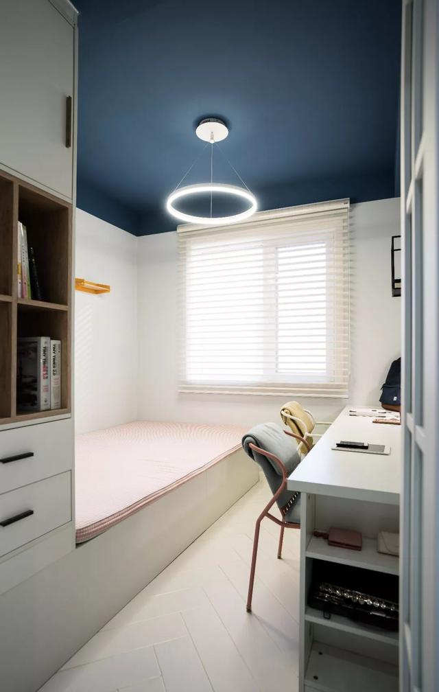 书房屋顶选择了深蓝色墙漆,在灯光的点缀下,如夜空一般。榻榻米+双人写字台设计,还有足够宽敞的过道宽。