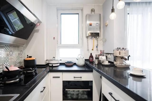 黑色的石英石台面搭配白色的橱柜简洁又大气。侧吸的油烟机也适合开放式厨房哦。