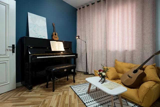 次卧现在是屋主的休闲艺术室,未来有孩子再改成儿童房。超级舒服的懒人沙发网购,便宜又舒服。深蓝色的墙面搭配一点姜黄色的撞色给空间增添活泼感。