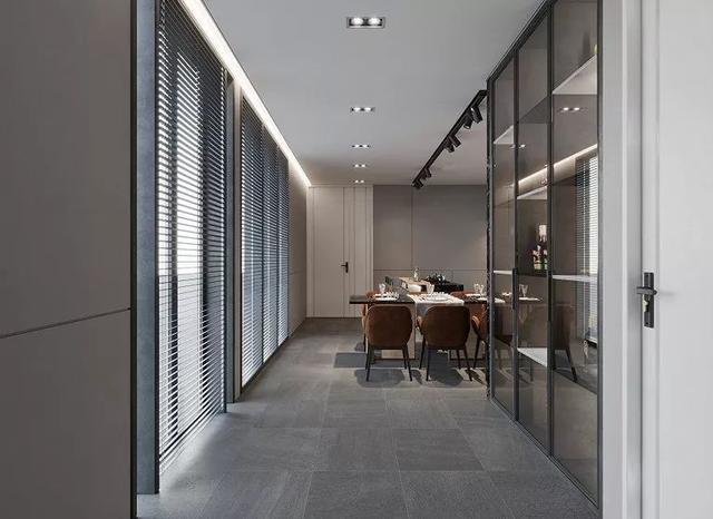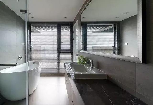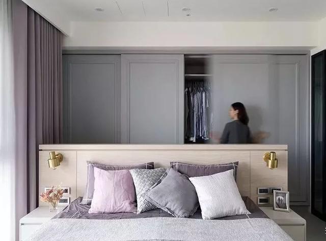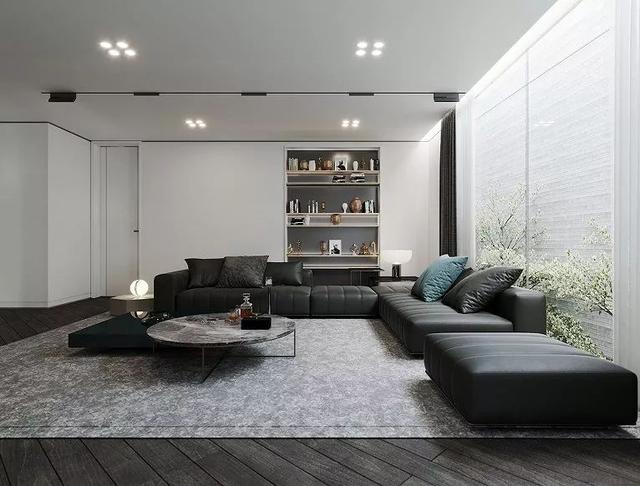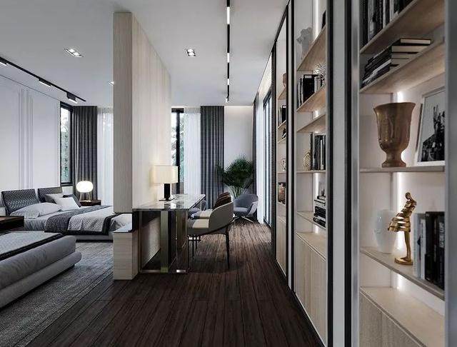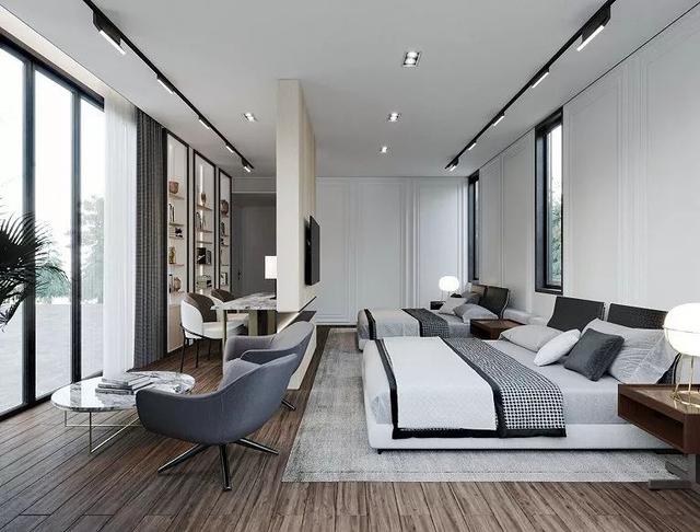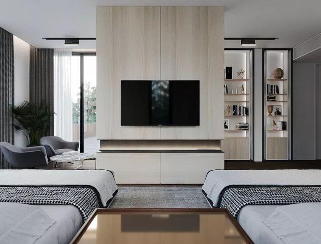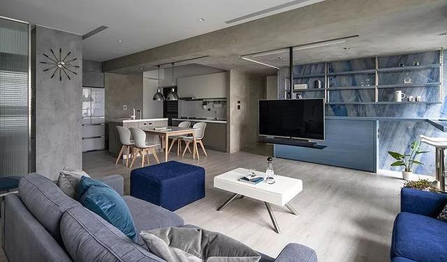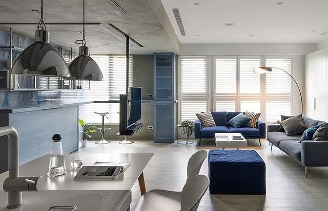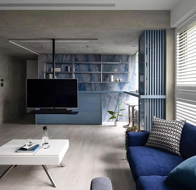 灰色裸墙与灰蓝色基调,配以各种纯度的蓝色。值得一提的是电视机安装位置,很有意思,可以360度旋转,满足各个空间观看需求。