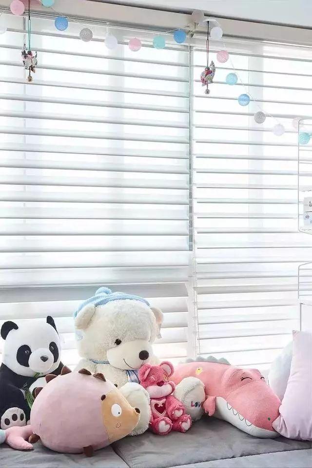 床尾书桌兼作梳妆台,配合地毯、抱枕和飘窗处的动物元素。