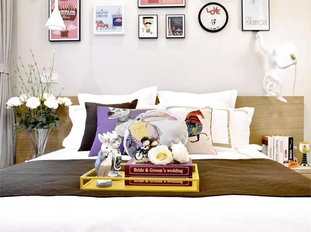 卧室氛围自由而舒适,原木温馨素雅的色调交织柔和的面料肌理,时尚独特的猴子壁灯活跃空间气质。清新的花艺装点卧室浪漫气质。
