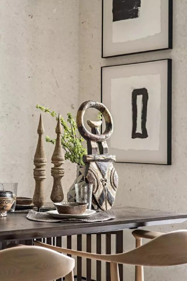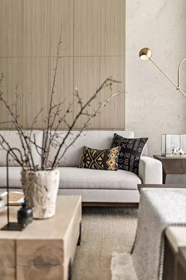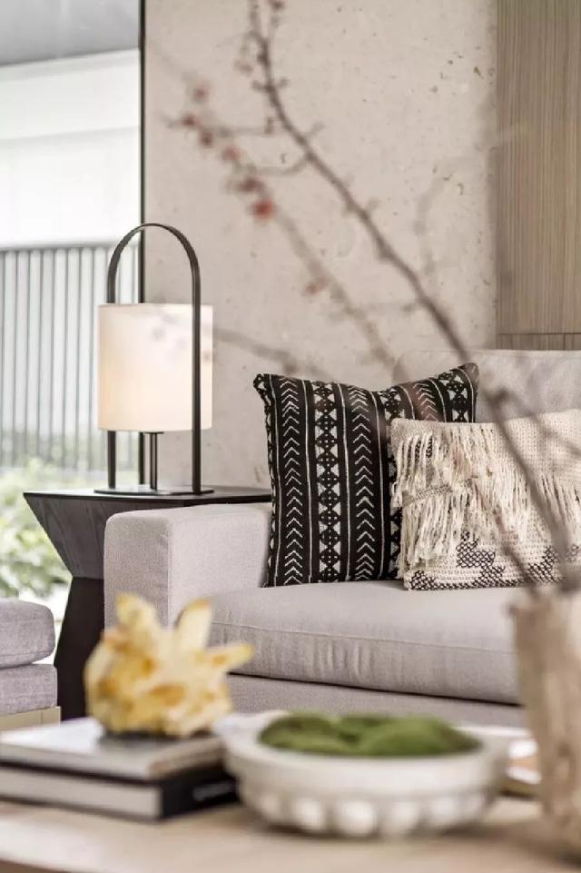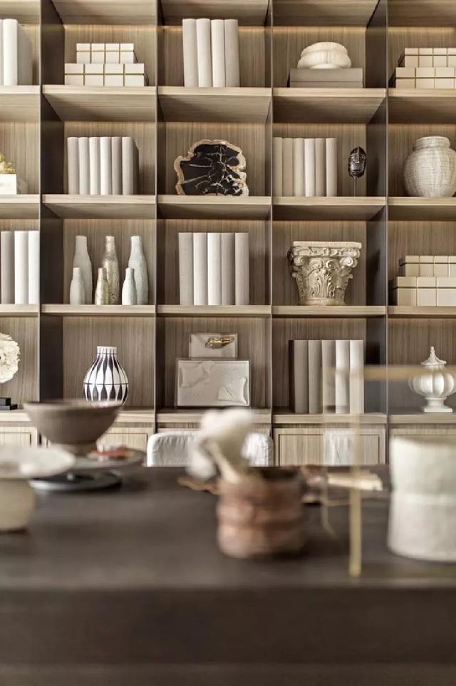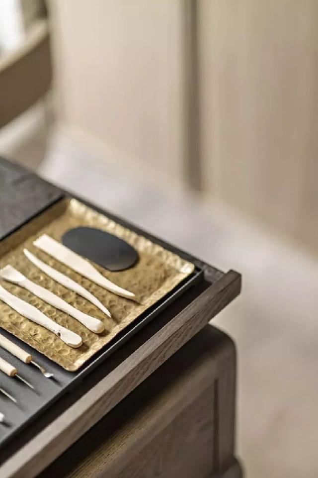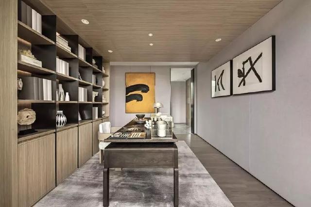 大片的自然木色为主调,温和的浅灰稍稍点缀,结合大理石和木材的自然纹理走向,让空间背景兼顾美观舒适,并植入安静纯粹的精神观感。东方的木几、瓷器、水墨画和现代的金属框格、灯饰、摆件,在“虚与实”、“显与隐”间相互作用,形成具有东方禅意的视觉张力。