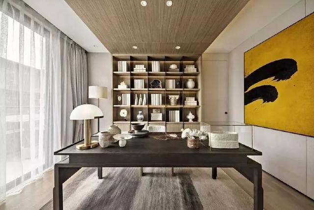 “壁间水墨画,为尔拂尘埃。”水墨画仿佛和帕里斯灰大理石墙面融为一体,挥毫几笔,东方禅意全出。又从现代的元素里面寻觅了颜色、材质,通过东方禅意美学的组合,将喧嚣张扬的明黄与水墨重组,为书房的沉静空间提了亮。