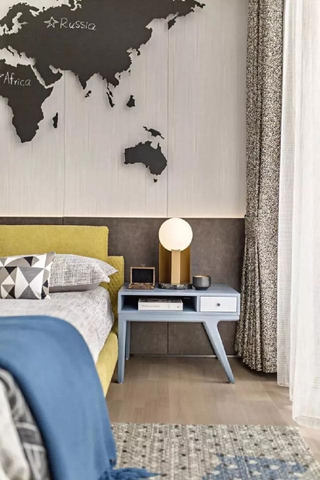 孩子的住处理应活泼鲜明,用大海的蓝和属于阳光的黄搭配床,充满童趣,世界地图挂在墙上,让孩子睁眼即世界,古朴的地图和望远镜、放大镜、指南针等小摆件,给予孩子一个发现世界、探寻人间宝藏的触动。探索与天真、求知与渴望,在这个儿童房里交织。
