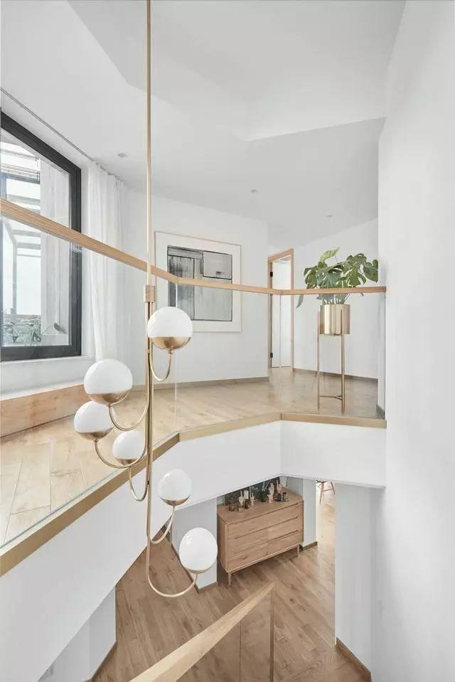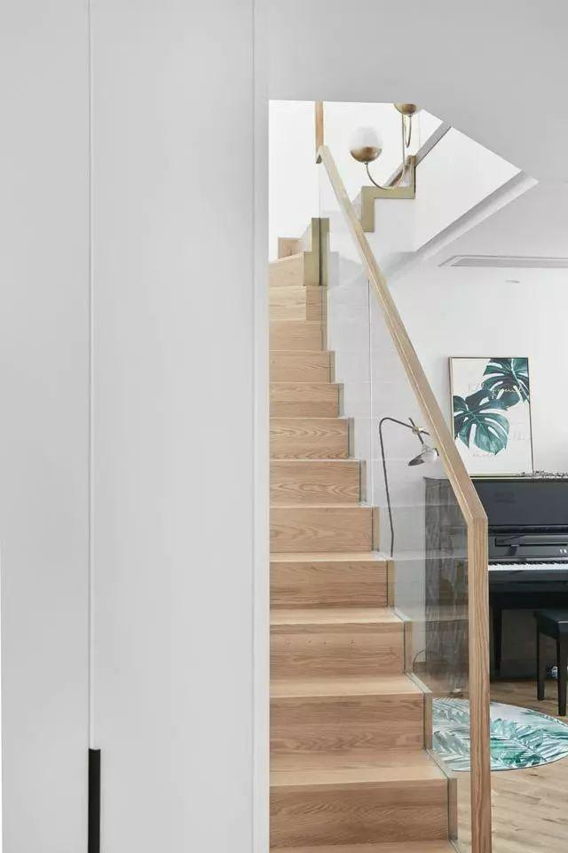 楼梯空间,相对而言,是一个单独的空间。保留通透性的前提下,楼梯栏杆设计为清玻搭配实木扶手。