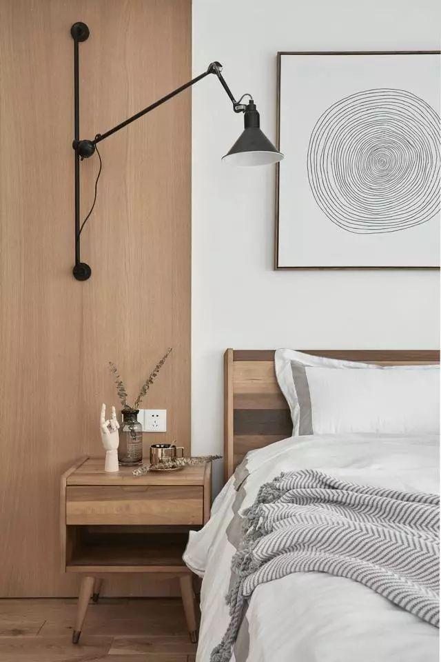 床头的黑色铁艺壁灯,方便业主晚上夜读所用,同时也给自然舒适的空间增添了几分文艺感。