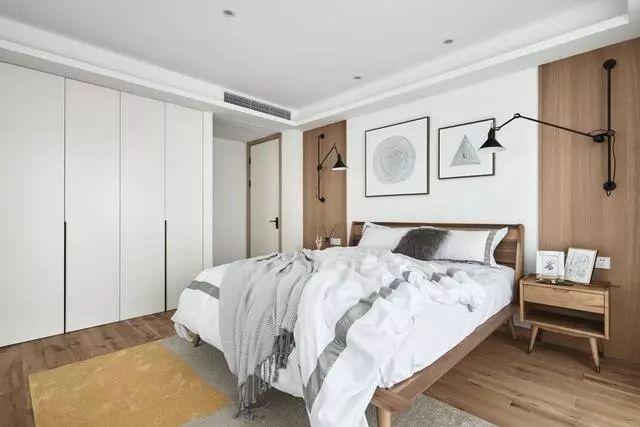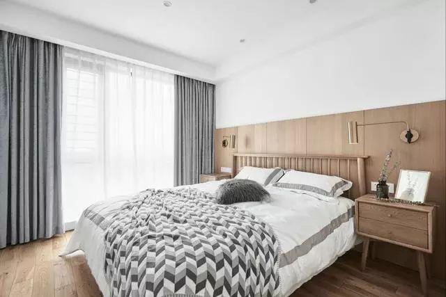 次卧与整体风格一致,木饰面半墙床头设计,看去更加舒适有格调。