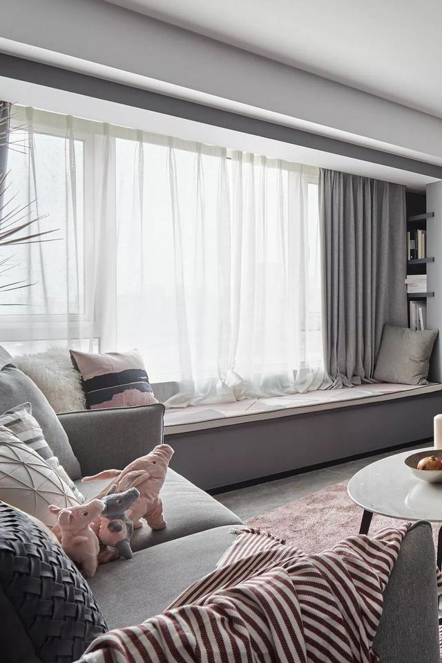 就连飘窗处的坐垫和抱枕,也延续了自带滤镜的灰粉基调,于不经意间演绎着优雅的极致魅力。