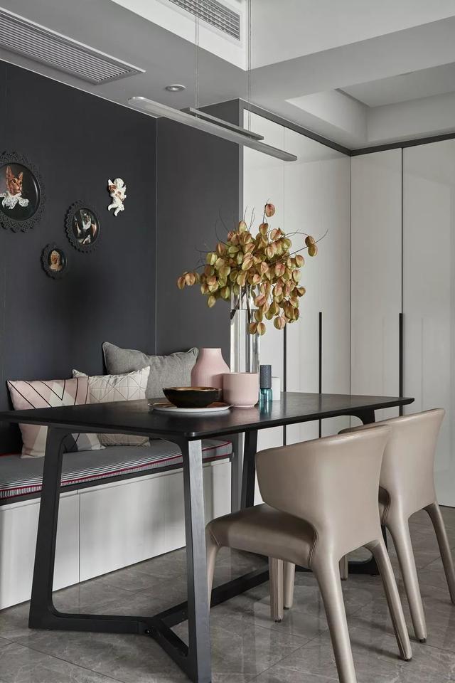 餐厅墙面装成灰色调的,给人以沉稳、静谧之感。然后搭配别致的复古挂盘去调和,餐桌上摆放精致的花束与餐具,令画面看起来更有层次感。