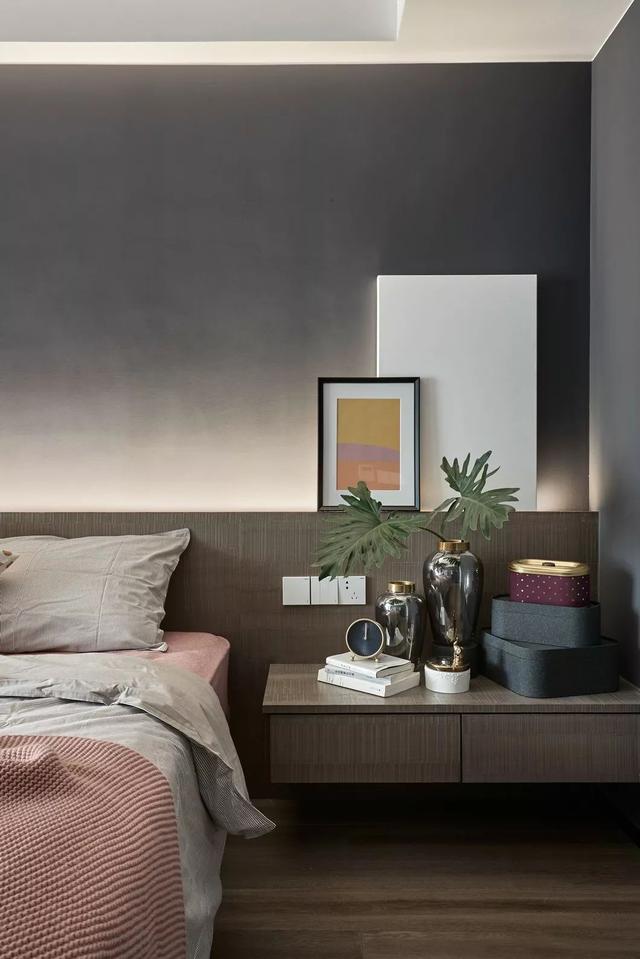 床头板和床头吊柜都是现场定制的,木饰面的肌理自然而独特,充分展现出和谐统一的美感。告别了大白墙,令卧室的时尚感瞬间飙升。