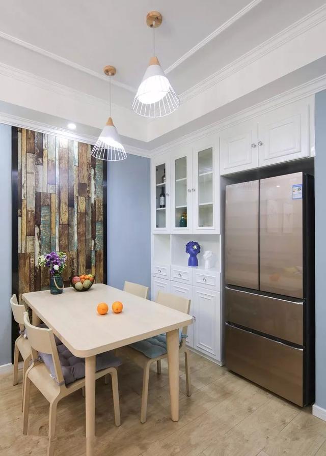 小户型的餐厅一侧做上了到顶的柜子,另一侧的墙面同样可以利用起来做装饰,比如文化砖、木饰面板、壁纸等,让餐厅看起来更美。