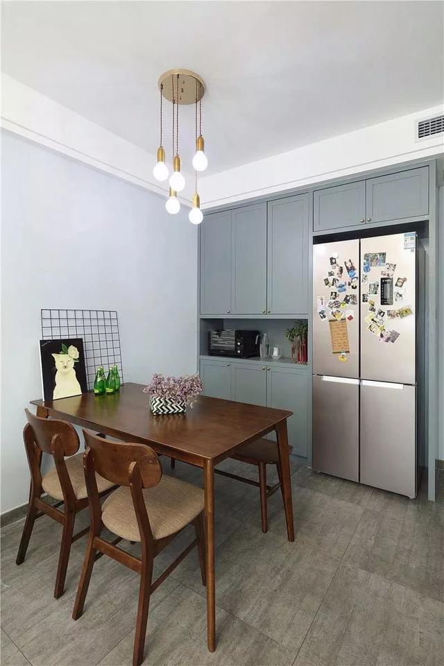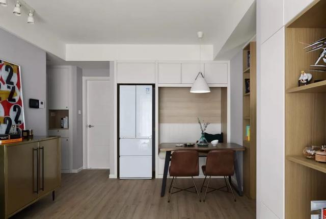比如上图这样的卡座和冰箱结合的设计,搭配顶部的吊柜和餐桌椅,整个餐厅占据的面积不到3平方,可以说是非常适合小户型了。