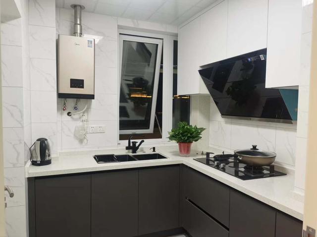 ▲厨房也是延续了高级灰。下面灰色橱柜,上面白色橱柜,搭配起来显得厨房更加明亮洁净。L型厨房,操作起来更加方便。