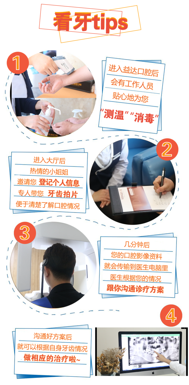 第一次来看牙的宝宝们,也不要慌张,益达口腔实现专人一对一服务,按照工作人员指示,一步步看牙打卡,解决口腔困扰!看牙时有任何疑问和困扰,都可以询问工作人员哦!