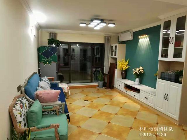 客厅,整体颜色以暖色为主,地面是美式仿古地砖,创造了自然、简约的视觉效果。蓝色布艺沙发搭配翠花绿单人椅,一种田园的自然与清新感随之而来。随处摆放的鲜花和绿植,又使得客厅充满了生机。