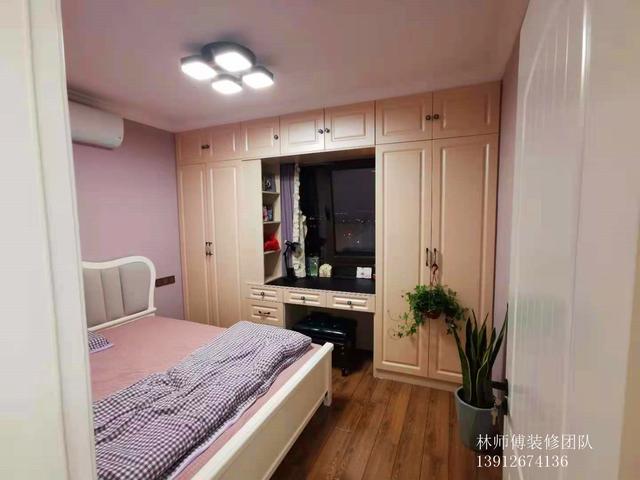 次卧,粉色墙面、香槟色橱柜,显得非常温馨。窗户改造成衣橱,两边是橱柜,中间作为书桌使用,采光也不错哦。