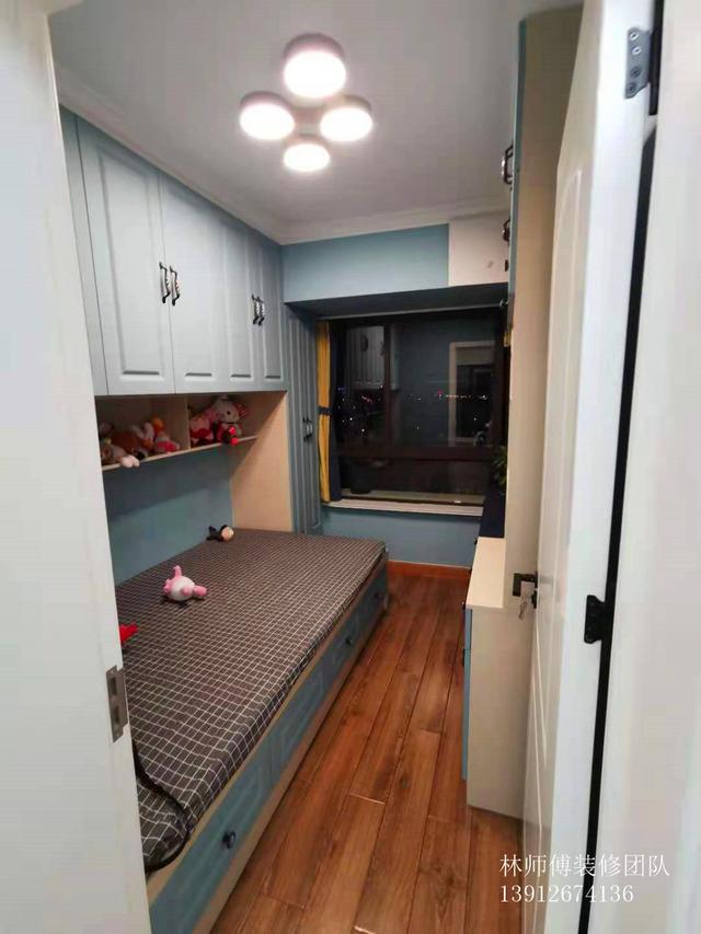 榻榻米小房间,靠墙做,上面是吊柜可以储物,下面是床。蓝色的墙面也很好看,吊柜下设计的开放式格子放了很多毛绒玩具,可可爱爱。