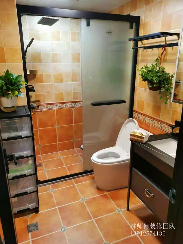 洗手间干湿分离,干净清爽。复古地砖延伸至墙面,整体统一,再用腰花分隔,很有层次感。
