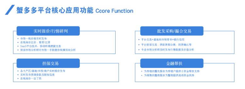平台通过整合以大闸蟹为主,覆盖蟹类全产业链蟹塘、蟹苗、饲料、药品、辅料、商品蟹及蟹黄蟹粉等深加工产品,打通供求信息发布、线上报价撮合成交、担保交易、线下物流、金融帮扶等在内的关键环节,打造以蟹为主的大水产生鲜全产业链型的实时在线的B2P2B综合服务平台。