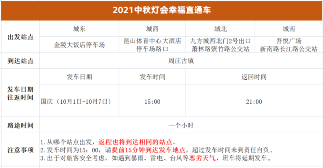 3、班车发车时间10月1日-10月7日每日15:00;如需班车请提前至少1天12:00前联系客服预约。