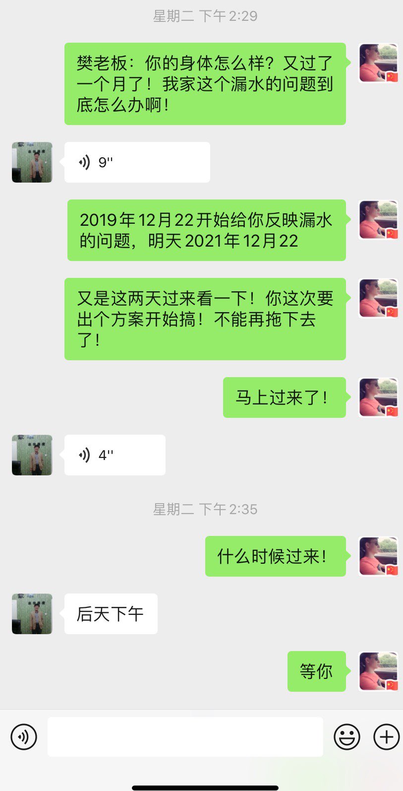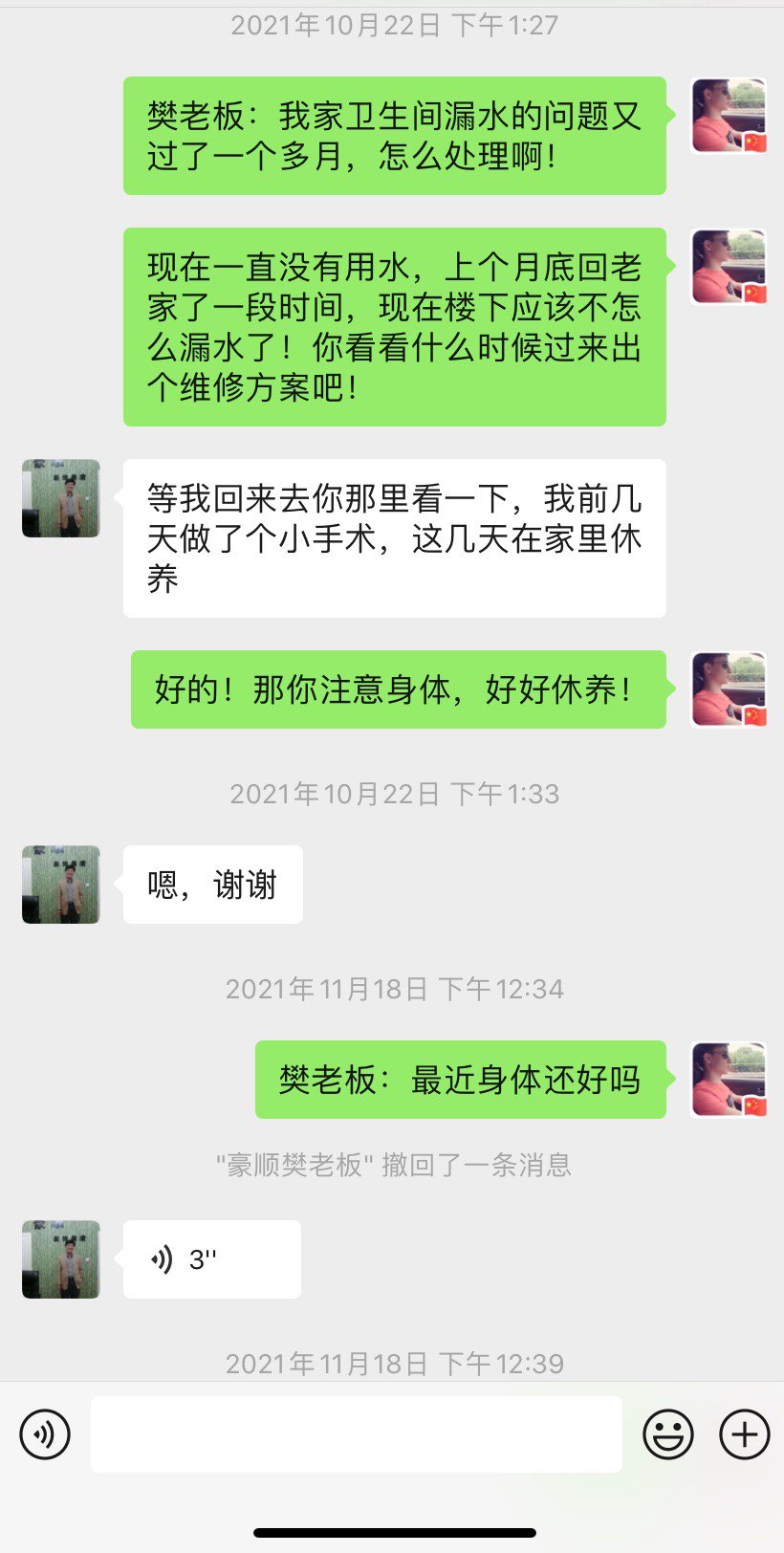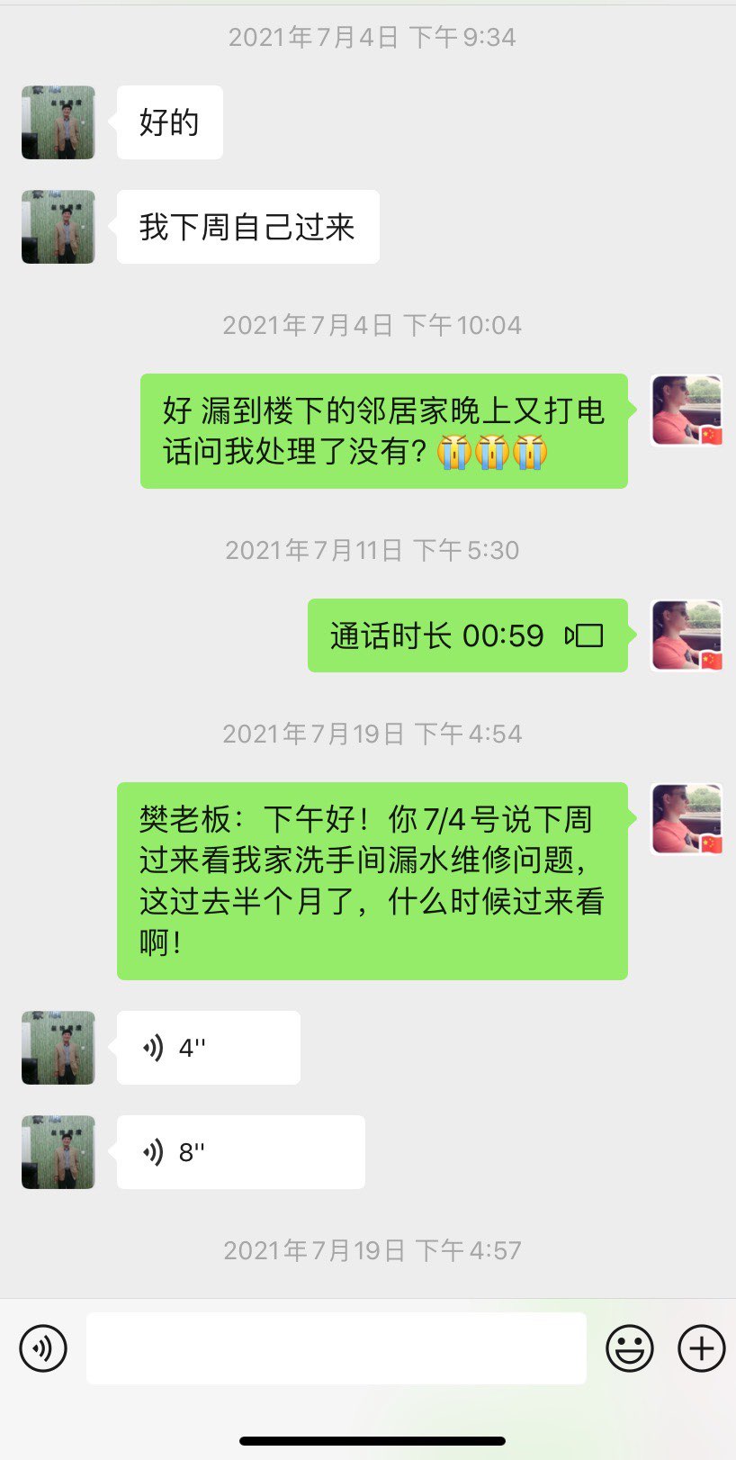 2017年初开始装修同年年底入住,2019年年底楼下反应我家洗手间漏水,我反馈给装修公司,公司两位负责人过来检查过,说是下水道管口和地面之间有间隙,让我自己打玻璃胶,我照办了。2020年楼下的主人跟随儿子一起换到其他地方居住带孙子,没有反馈漏水状况,今年上半年又反馈漏水严重,6月8号我找装修公司,答应过来检查,于7月4日来了一个水电工,打开马桶的水管部位,底下确实有积水(如下图)后来就一直说要找原因,期间基本每个月都跟催他至现在,公司老板回复要么工人回家了,要么工人黄码不能进小区,要么自己生病做手术,每次约他上门处理总是推脱,直至12/21号答应我23号下午上门处理,又说家里有事回家了!家里洗手间打开一堆土放在里面半年多了,一直处于暂停使用状态。我真的不知道有什么办法可以处理此事!期间让我出一部分钱我也答应了!希望有高人或者遇到类似情况的网友帮忙指教!不胜感谢!