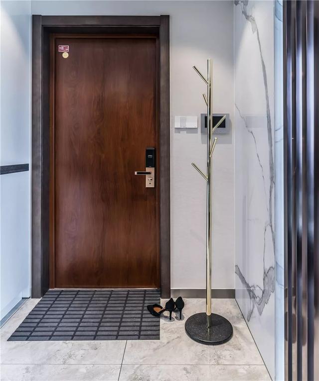 入户的玄关走廊,一侧做了到顶的嵌入式柜子,另一侧就设计成了大理石的墙面,搭配金属制的挂衣杆,显得高档而又大气。