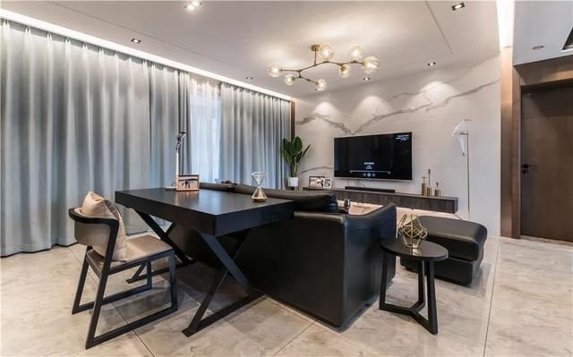 电视背景墙同样也是设计成了大理石的款式,沙发的背后直接摆放书桌椅,这款窗帘和整体设计的结合也显得非常的大气。