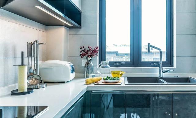 厨房内部的空间会小一些,采用了偏冷的色调,白色的操作台面搭配有序的厨具收纳,营造了清爽利落的烹饪格局。