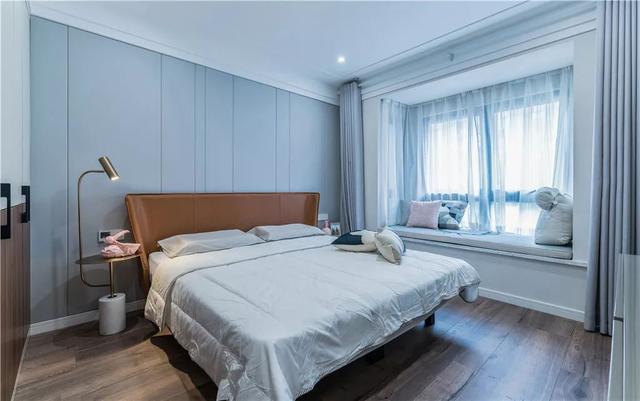 主卧室的床头背景墙设计成了淡蓝色的硬包造型,和窗帘、飘窗结合起来,带有丝丝梦幻的感觉,给人一种优雅、精致的感受。