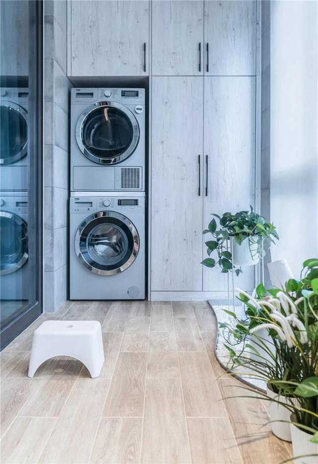 阳台处铺贴了木纹砖,和灰木色的柜子形成对比,洗衣机和烘干机被包在了柜子当中。阳台摆放了绿植和小石子,更有休闲区的感觉。