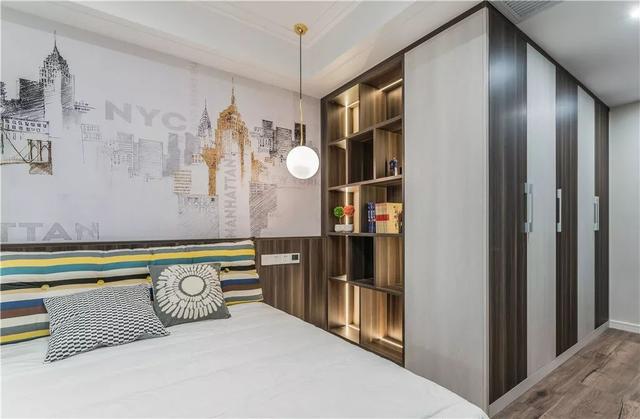次卧的床头背景墙直接铺贴了壁纸,收纳都设计成了入墙式的,可以节约一些卧室内的空间,舍弃了床头柜用壁龛做收纳,更加奢华、大气。