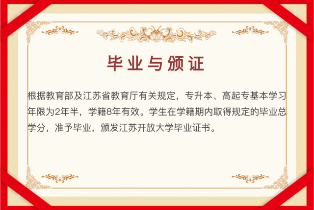 ●学生在学籍期内取得规定学分准予毕业,颁发江苏开放大学毕业证书。