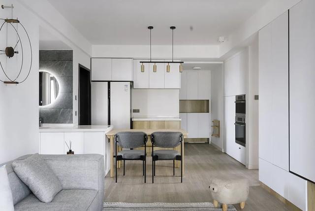 冰箱虽然设在厨房外,但取、洗、切、炒的动线很流畅,提前确定尺寸,与定制的吊柜和地柜收纳柜到达严丝合缝的视觉感。