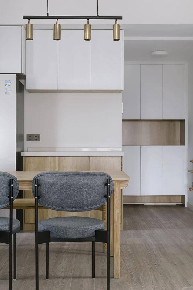 从灰色地砖、橡木色柜门过渡到白色台面,拉伸了空间层次感,使狭小的厨房显得更为开阔。
