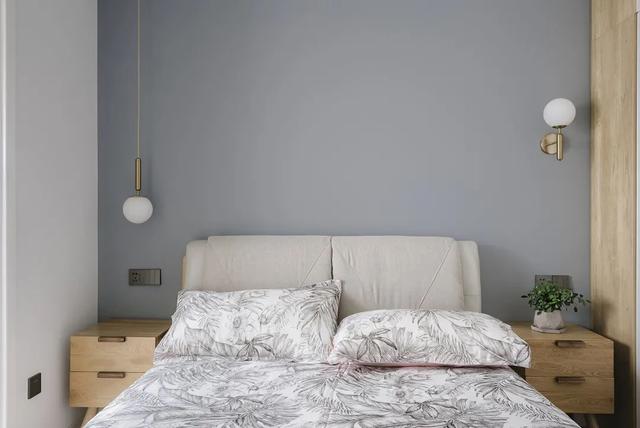次卧空间更从容,背景墙选用比较明亮的灰蓝,与整体风格呼应。一株长势极好的鹤望兰,翠绿的生机,偶尔让眼睛得到舒缓。