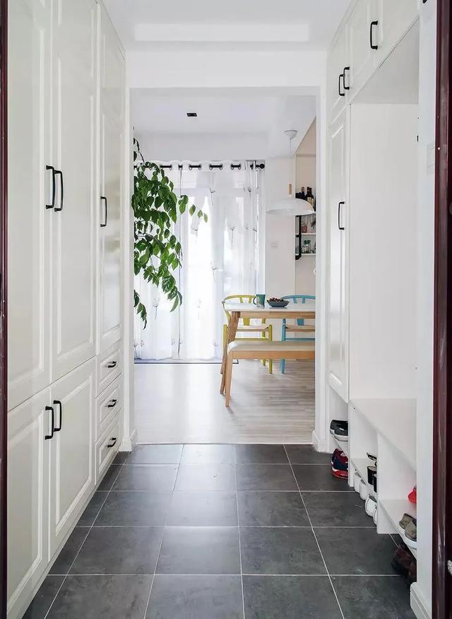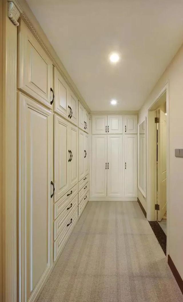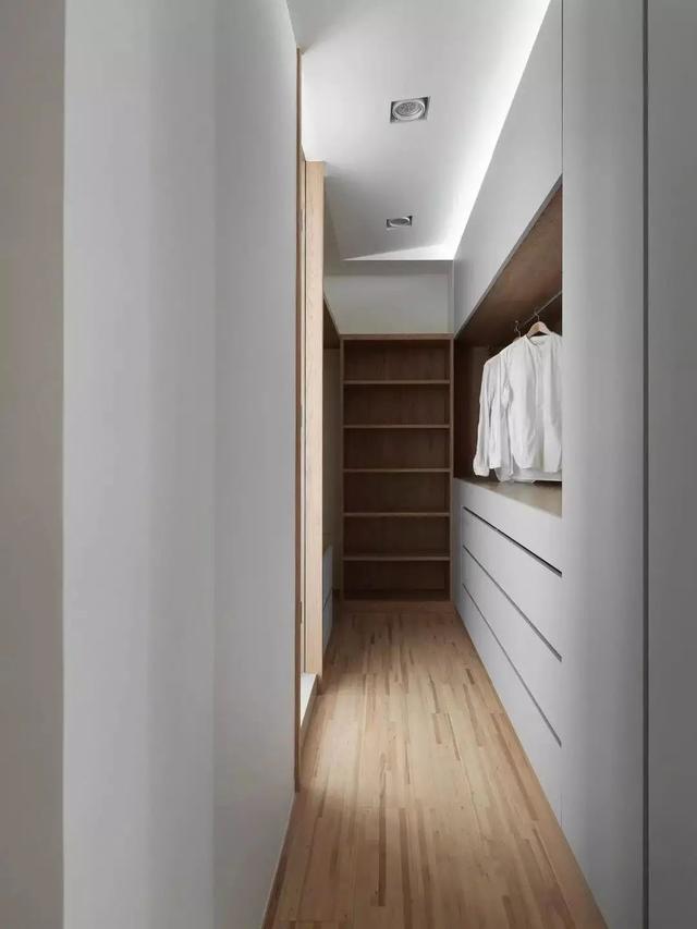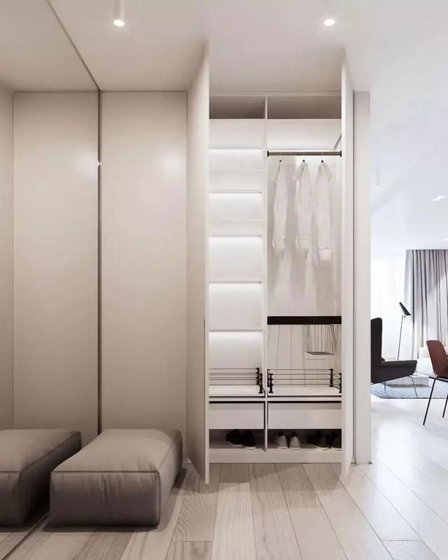 优点:现在的很多户型过道空间非常大,往往浪费了。如果走廊空间较为宽敞,左右两边做成衣帽间也是非常不错,可以兼顾日常收纳。