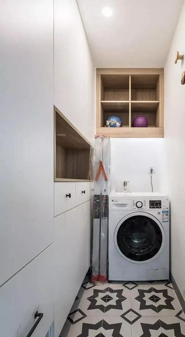 优点:家里有双阳台,可以把其他一个不朝南向的阳台封闭起来。在这里放置干衣机和洗衣机,再搭配小型衣帽间,收纳和换洗可以同时进行。可以再设计一个熨烫机,干衣机的衣物直接熨烫后放入衣帽间非常方便。
