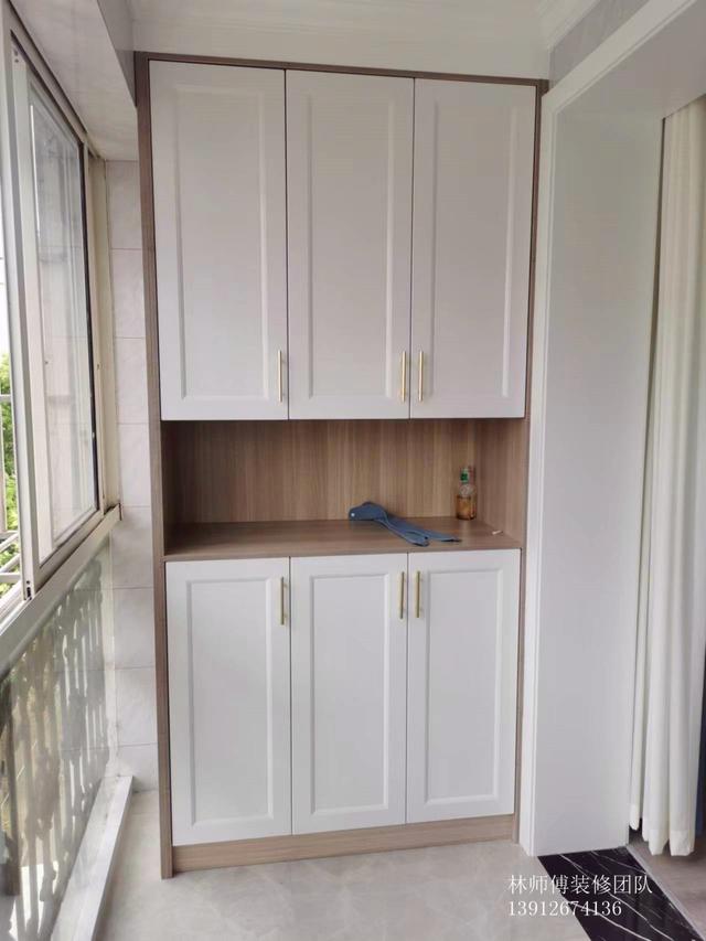 阳台也是设计了一面到顶的橱柜,来帮助小户型收纳。内嵌的设计,不占用空间。白色和原木,和家里的整体风格一致。