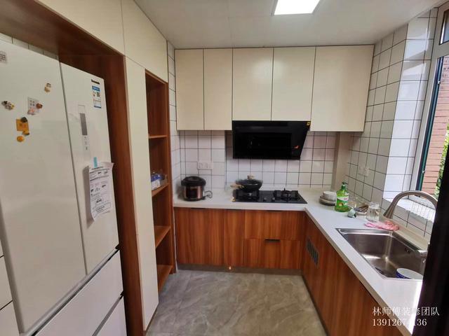 厨房的风格也是延续了客餐厅的,冰箱做了内嵌的设计,看起来更整洁,橱柜一直延伸到灶台,收纳充足,靠近灶台边设计的是开放式的隔板,放一些随手拿去的物品很方便。而灶台和水池是L型的布局设计,符合日常动线。