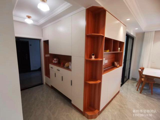 餐边柜也是沿袭了玄关柜的风格,白色+木色,中间部分是开放式的,上下是封闭的柜子,增加餐厅的收纳能力。