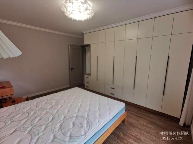 主卧的床尾设计了一整面墙的衣柜,收纳很充足,白色的羽毛灯,温馨又浪漫。木地板增加了家里的舒适感。